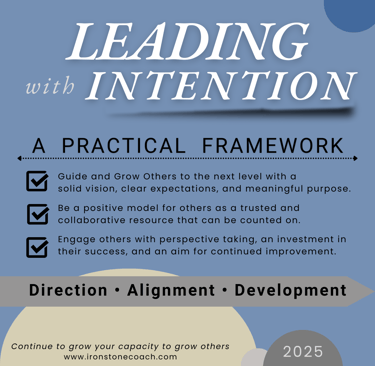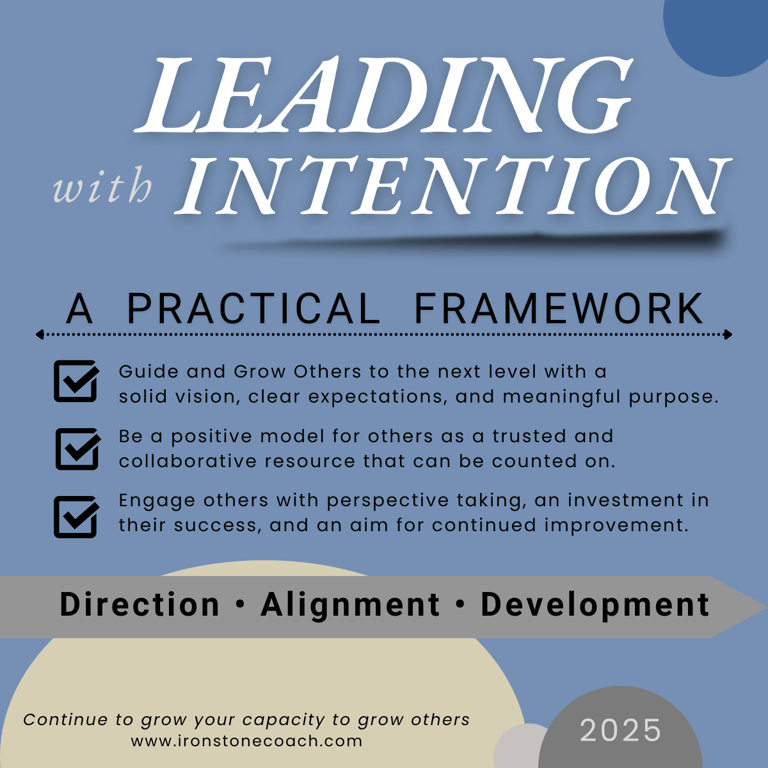 Regardless of our particular industry or job title, Lets Lead with Intention using a framework of Direction, Alignment, Development.